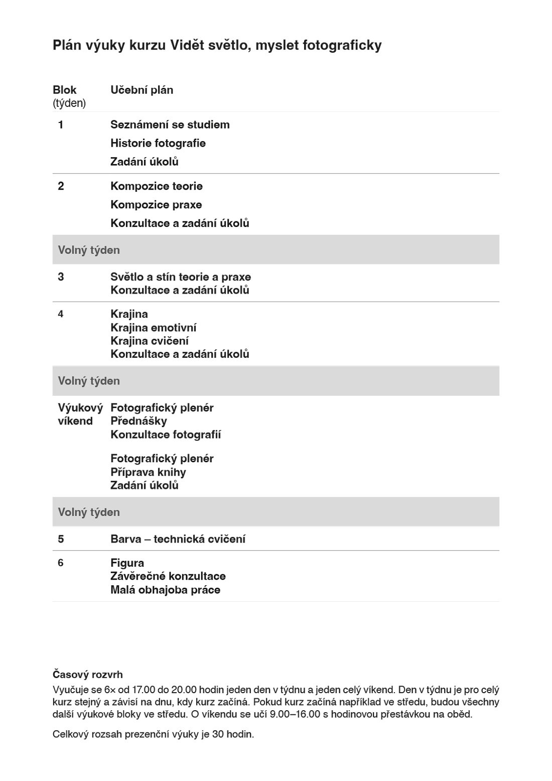 Výuka probíhá během 6 setkání po 3 hodinách (od 17.00 do 20.00 hod.) a jednoho víkendu, kdy se po oba dny učí od 9.00 hod do 16.00 hod (s hodinovou přestávkou na oběd). Podvečerní tříhodinová setkání jsou 1× týdně. Den v týdnu se pravidelně opakuje podle dne, kdy kurz začal. Například pokud kurz začne v úterý, všechny další lekce budou také v úterý. Pokud by některý výukový blok připadl na státní svátek, termín se posune o týden. Během celého kurzu jsou 3 volné týdny, abyste měli dostatek času na vypracování tématických úkolů. Celkový rozsah výuky je 30 hodin.
