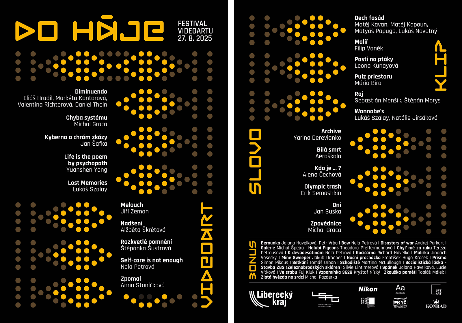 videoartu. Hlavní program odstartuje po 20.00 hodině, ale začínáme už od 17.00 hodin venkovní výstavou fotek a jiných uměleckých artefaktů V Háji. Od 18.00 hodin vás čeká workshop video techniky firmy Nikon a současně poběží projekce na dvou scénách. K tomu nebude chybět sud piva Konrád a skvělá atmosféra. Letošní ročník videoartu podpořil Liberecký kraj.