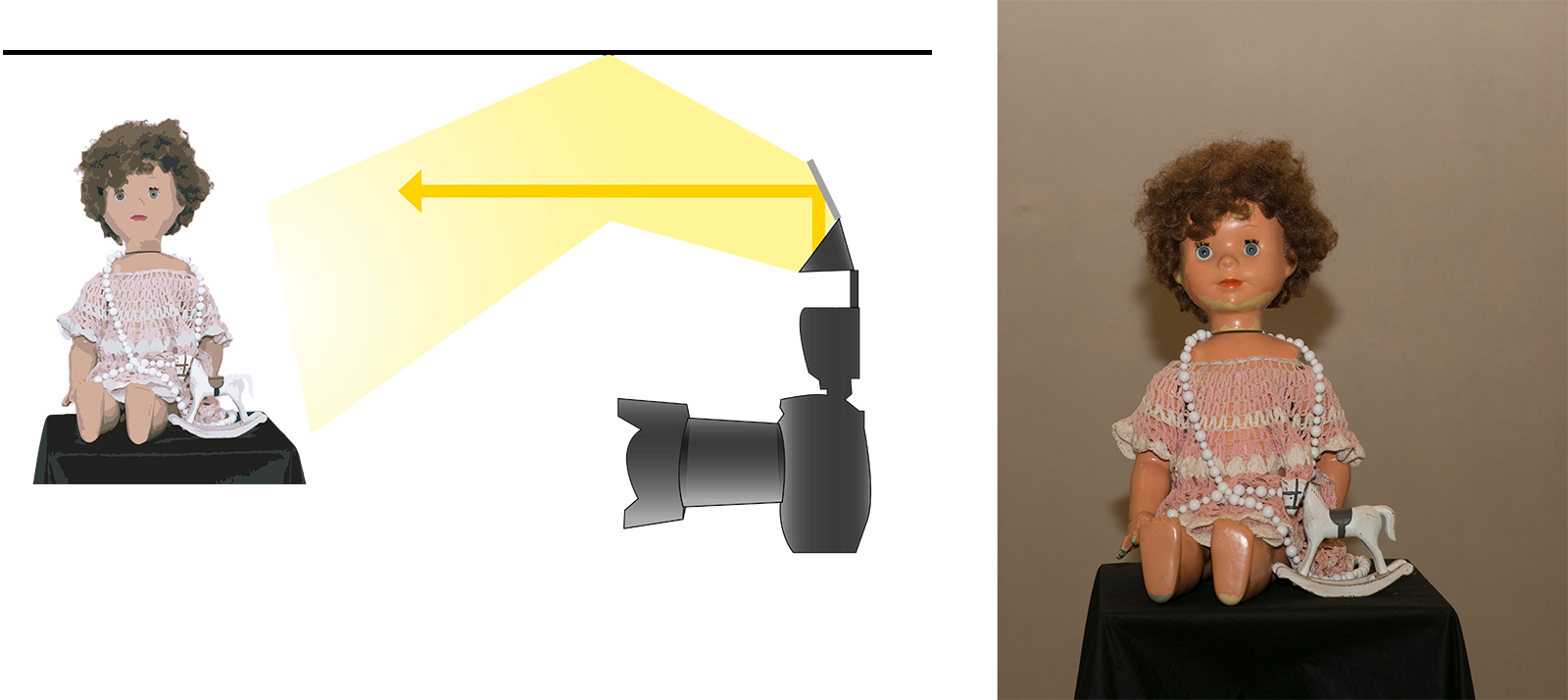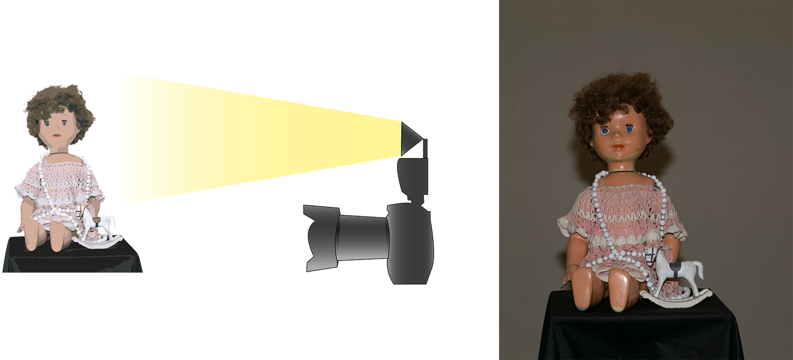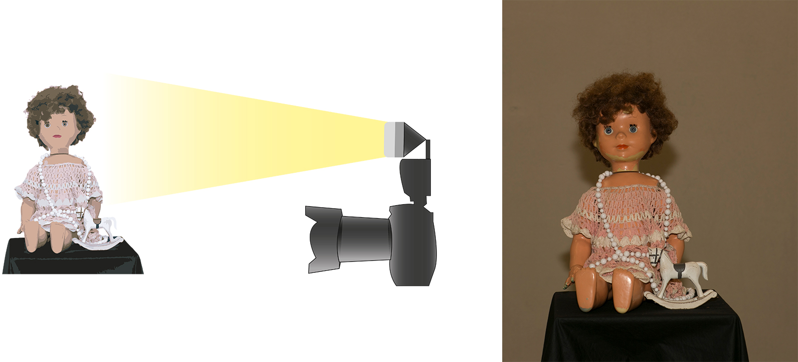 Koukněte na ilustrační obrázky. Použili jsme zátiší s panenkou a koníčkem. Oba záběry byly vytvořeny v místnosti s běžným, stropním (zářivkovým) osvětlením. Na prvním záběru byl expoziční čas natolik krátký, že nedovolil zářivce, aby se projevila. Výsledek lze hovorově nazvat „Panenka v tunelu“. U druhého záběru se posunul čas (s využitím stativu) až na 10 sekund (clona a intenzita blesku zůstaly stejné). Výsledek je výrazně „prokreslenější“ a začíná se projevovat i jiné zabarvení snímku, které je dané rozdílnými zdroji světla a jejich teplotou chromatičnosti.