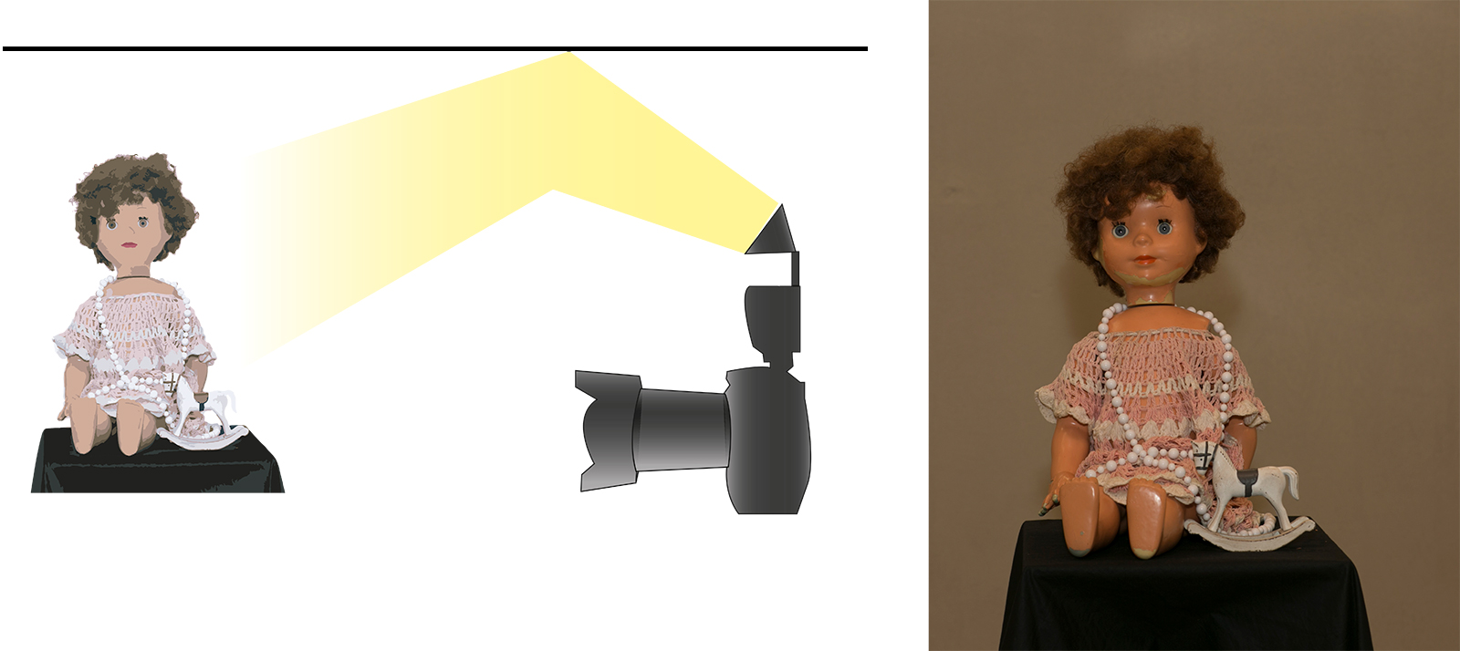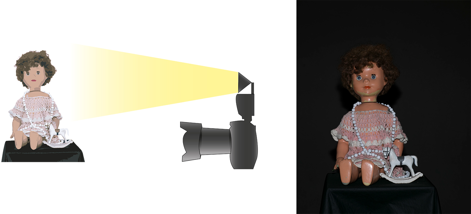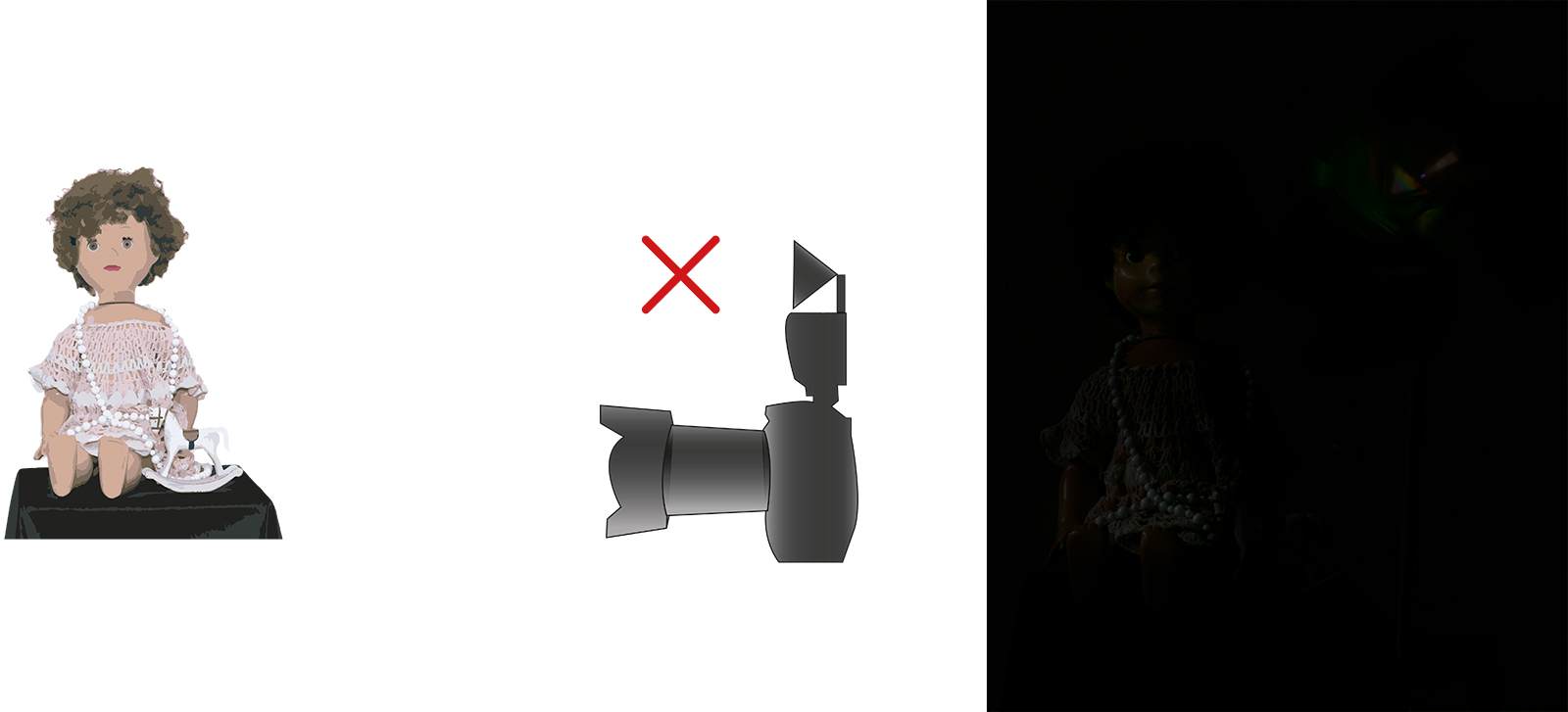 Koukněte na ilustrační obrázky. Použili jsme zátiší s panenkou a koníčkem. Oba záběry byly vytvořeny v místnosti s běžným, stropním (zářivkovým) osvětlením. Na prvním záběru byl expoziční čas natolik krátký, že nedovolil zářivce, aby se projevila. Výsledek lze hovorově nazvat „Panenka v tunelu“. U druhého záběru se posunul čas (s využitím stativu) až na 10 sekund (clona a intenzita blesku zůstaly stejné). Výsledek je výrazně „prokreslenější“ a začíná se projevovat i jiné zabarvení snímku, které je dané rozdílnými zdroji světla a jejich teplotou chromatičnosti.