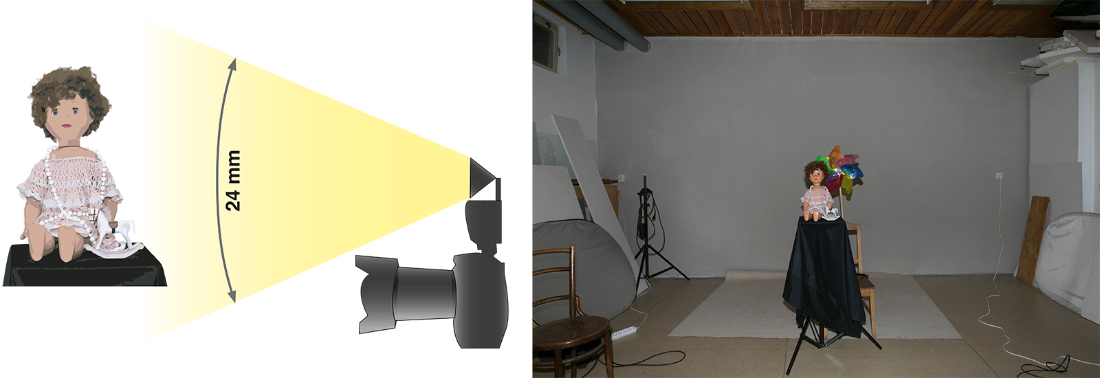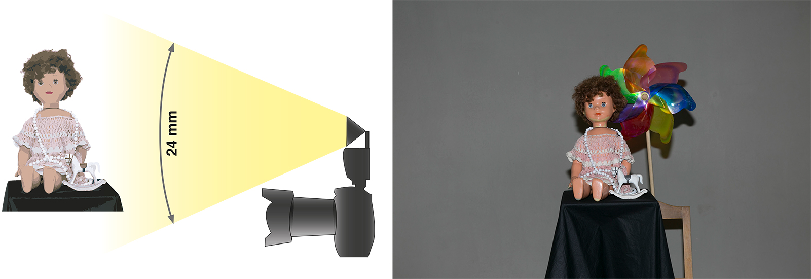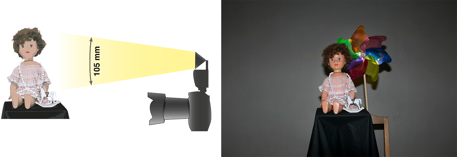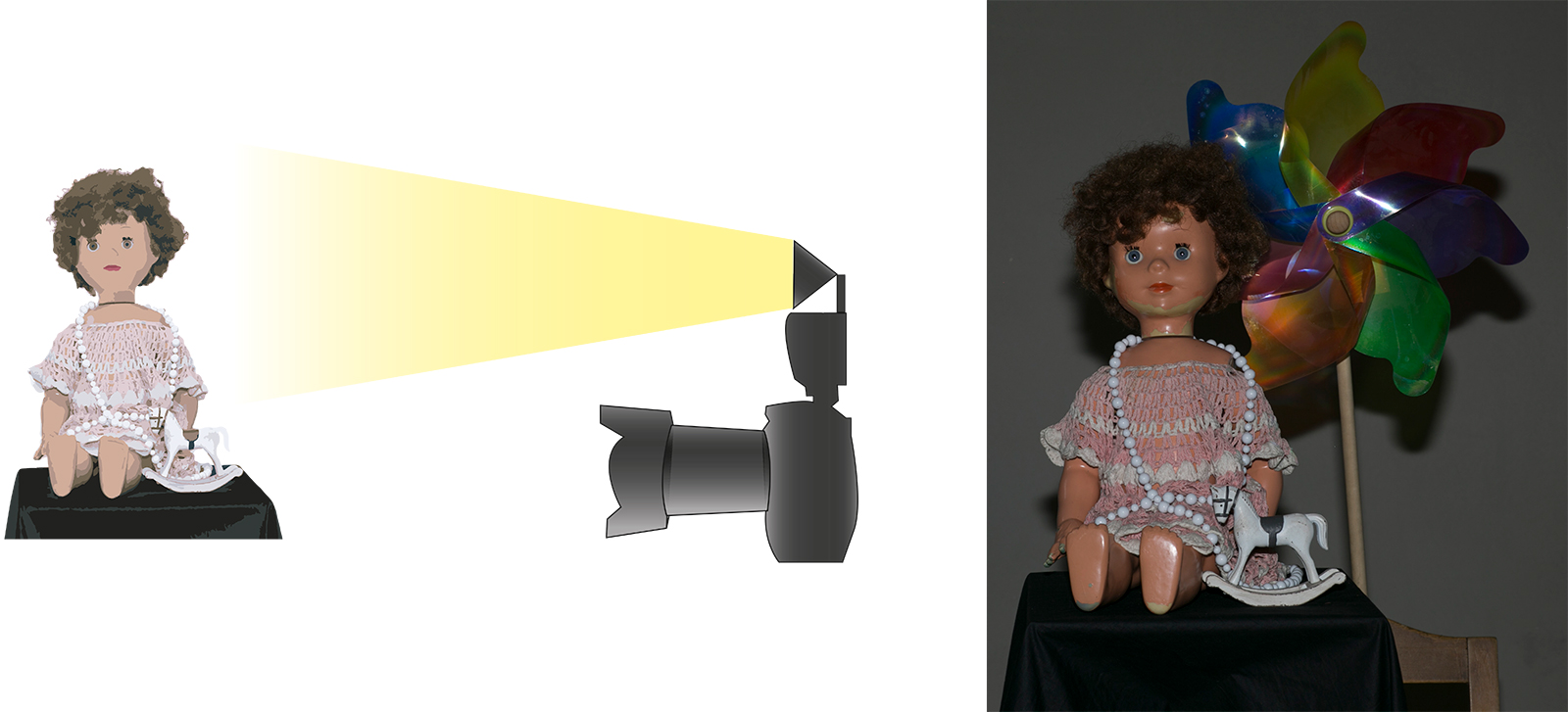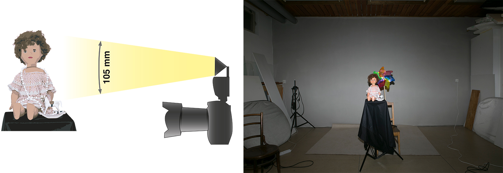 Podívejte se na obrázky. K panence se přidal točící větrník. Na obrázku vlevo je exponováno 10 sekund. Zcela nepatrné světlo (nebyla absolutní tma) v ateliéru umožňuje rozpoznat siluetu scény. Na záběru vpravo se do stejně dlouhé expozice spustil záblesk. Větrník je ostrý. Blesk „zmrazil“ pohyb, který by jinak byl úplně rozmazaný.