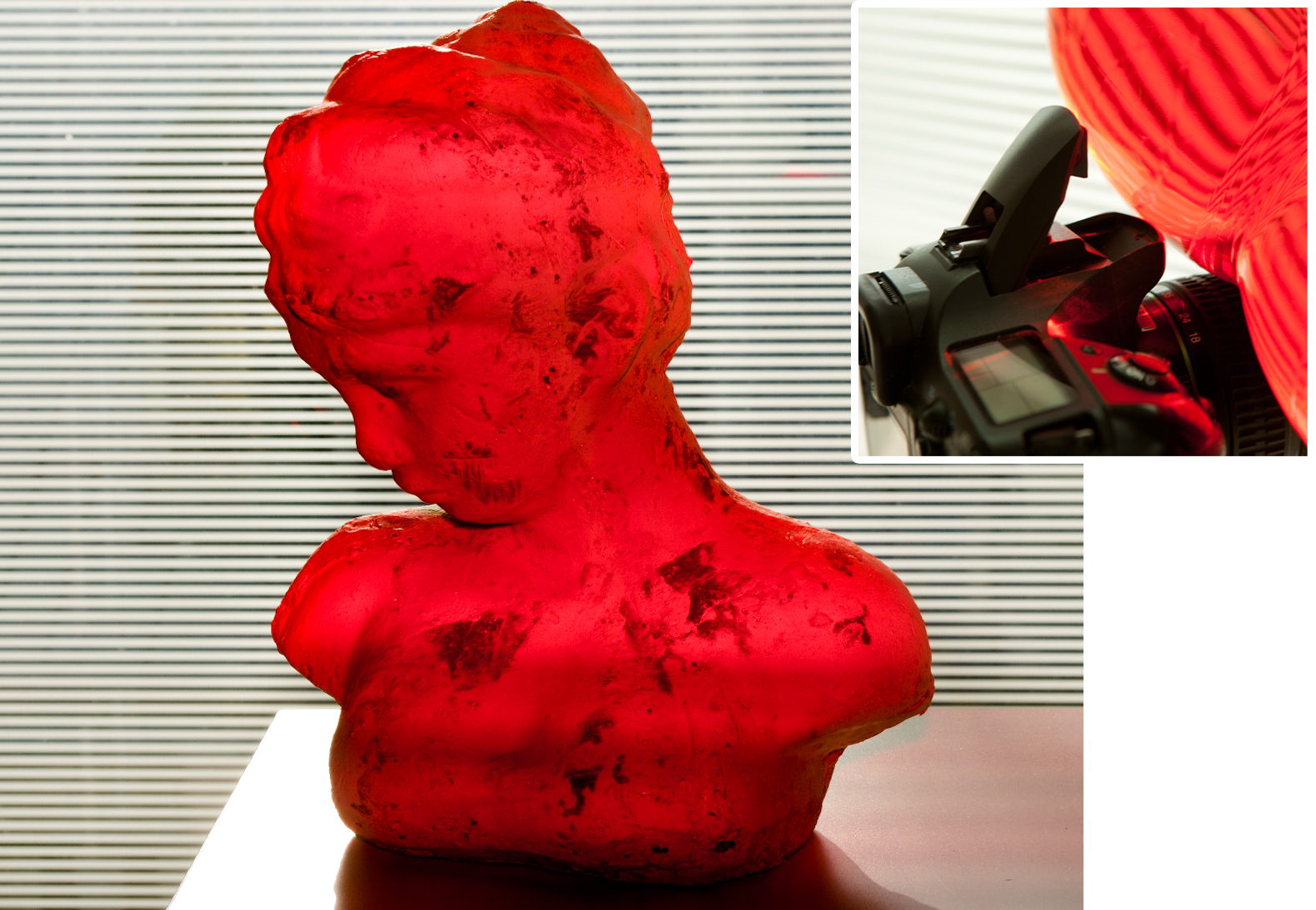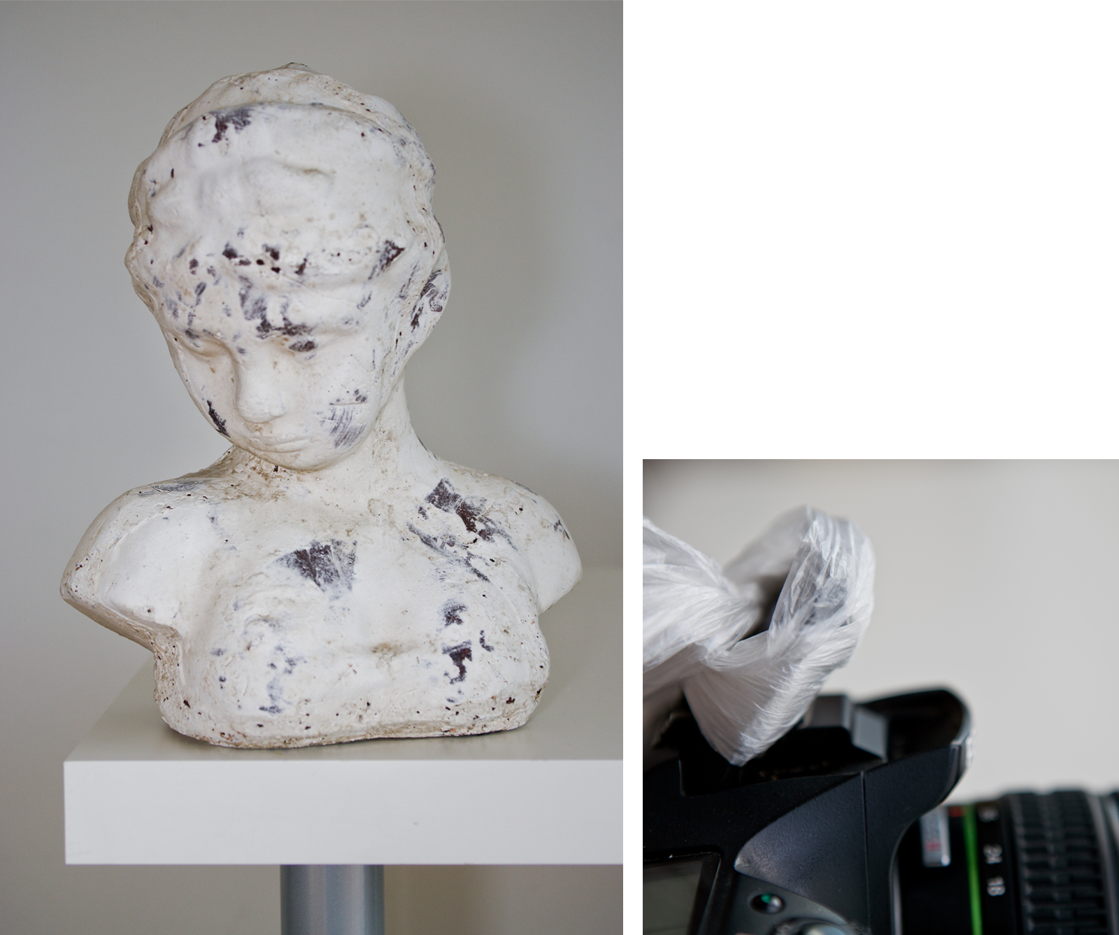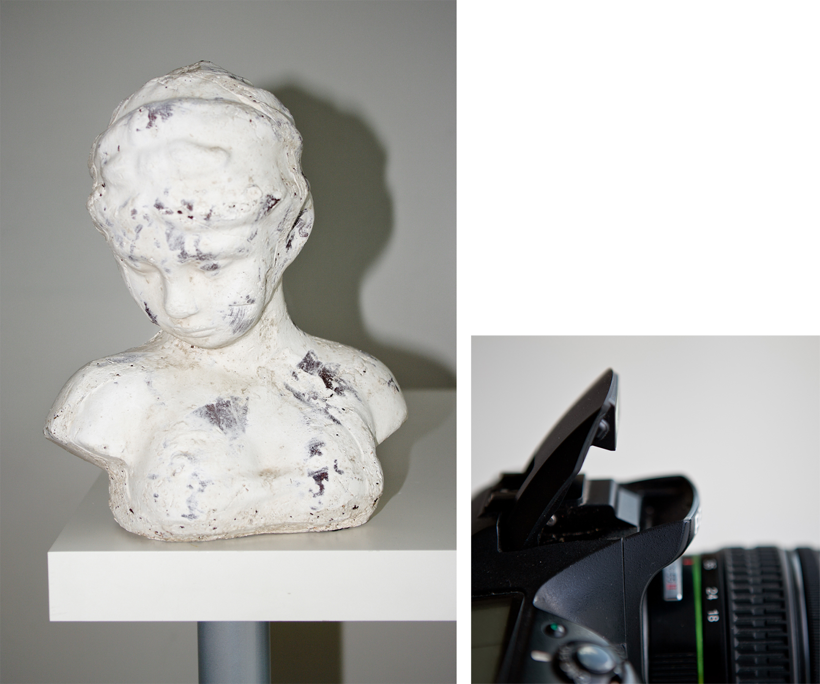 Koukněte na následující obrázky. Na obrázku vlevo je použitý přímý blesk. Záběr je tvrdý a ruší hluboký stín za hlavou. Pokud chcete stín změkčit, stačí kolem blesku omotat igelitový pytlík.